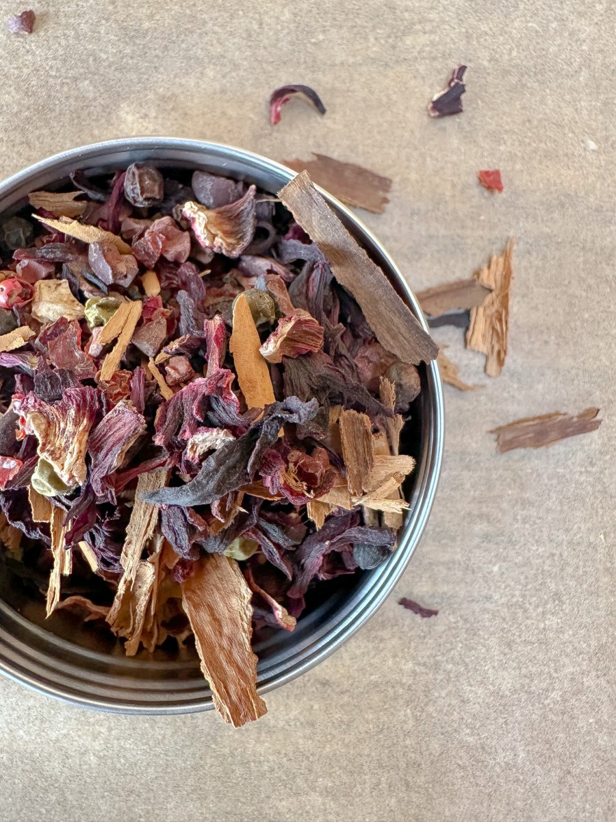 Don’t let the [insert here] generic name fool you, this tea is awesome. It even looks like Valentine’s Day! We’ve got hibiscus flower, rose hips, cacao, cinnamon, vanilla bean. All of these sexy ingredients for such a sexy holiday. I source my ingredients from Mountain Rose Herbs.