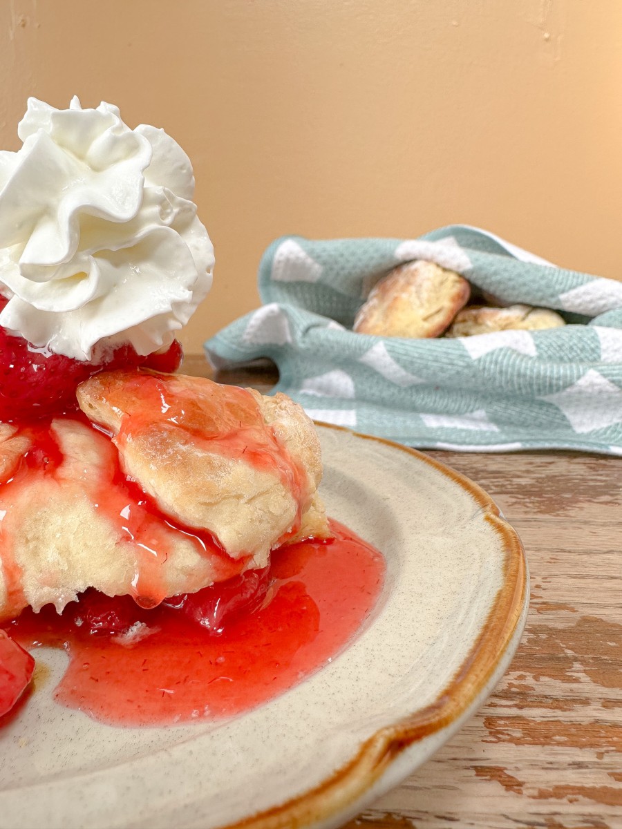I’ve been eyeing this tub of strawberry shortcake glaze at the grocery store. It’s given me a hankering, but I don’t love the chemically processed stuff. Instead I wanted to try my hand at making my own, and I have to say it turned out pretty well! I turned it into chamomile glazed strawberry shortcake.