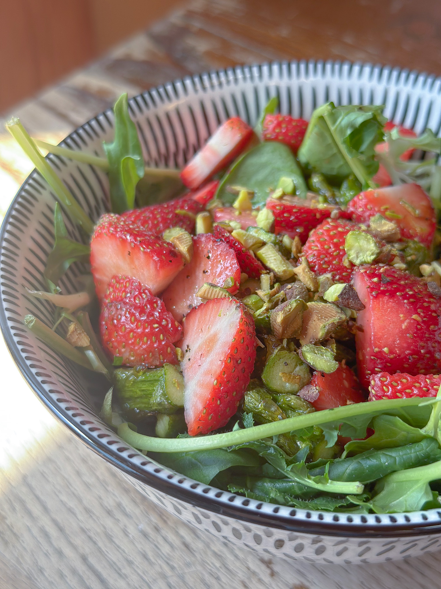 - Combine the spring greens, roasted asparagus, strawberries and combine.